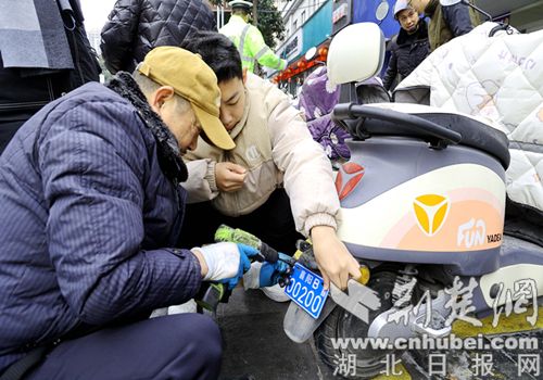 荆楚网(湖北日报网)讯(通讯员 欧阳智慧 李辉敏)1月18日,在保康县公安局交警大队城关中队门口电动自行车临时上牌点,市民王先生免费领到“襄阳B00203”电动自行车号牌,这是该县警方为顺应市民电动自行车上牌诉求,联合人保财险保康分公司,在家门口集中为市民办理的电动自行车免费上牌业务。