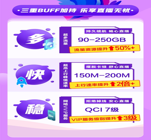 以湖北移动的5G直播套餐为例,共有三档套餐档位可供选择,三重BUFF叠加:流量资源提升50%、上行速率提升2倍、VIP服务级别提升3级,还有至高250GB大流量,播主直播无惧流量消耗,享有同区域内视频直播场景下的网络优先服务,摆脱直播卡顿、掉线等情况,网络稳定流畅无阻,有“多、快、稳”三个特点。