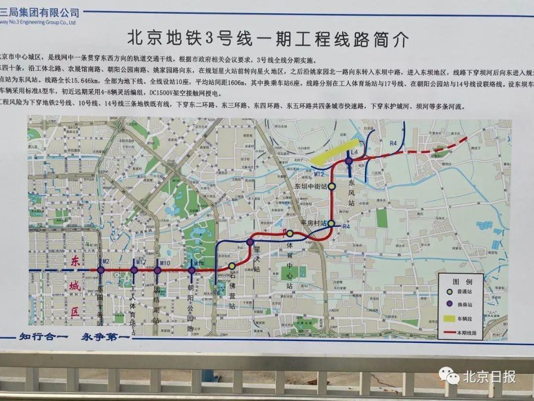 此前报道,北京地铁3号线一期工程西起东四十条,沿工体北路、朝阳公园南路向东,至姚家园路向北转至北京朝阳站,之后一路向东进入东坝地区,终点站为东风站。线路全长15.6公里,全部为地下线,共设车站10座,其中换乘车站6座。