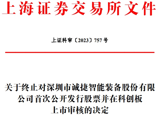 日前,诚捷智能和保荐人招商证券股份有限公司分别向上交所提交了《深圳市诚捷智能装备股份有限公司关于撤回首次公开发行股票并在科创板上市申请文件的申请》和《招商证券股份有限公司关于撤回深圳市诚捷智能装备股份有限公司首次公开发行股票并在科创板上市申请文件的申请》,申请撤回申请文件。根据《上海证券交易所股票发行上市审核规则》第六十三条的有关规定,上交所决定终止对诚捷智能首次公开发行股票并在科创板上市的审核。