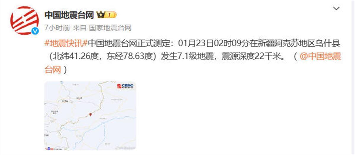 中国地震台网正式测定:01月23日02时09分在新疆阿克苏地区乌什县(北纬41.26度,东经78.63度)发生7.1级地震,震源深度22千米。