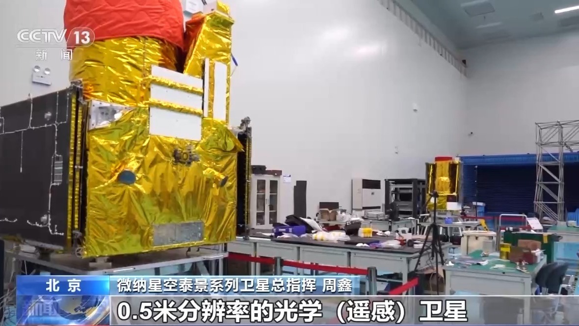 微纳星空泰景系列卫星总指挥 周鑫:这5颗星都是泰景系列的遥感卫星,我们身边的这颗就是一颗0.5米分辨率的光学遥感卫星。当我们从天上去拍摄的时候,我们拍摄一辆小汽车,能看到车辆运行的方向,它可以为我们的资源普查、城市规划、环保等这样一些领域能够提供很重要的数据支撑。