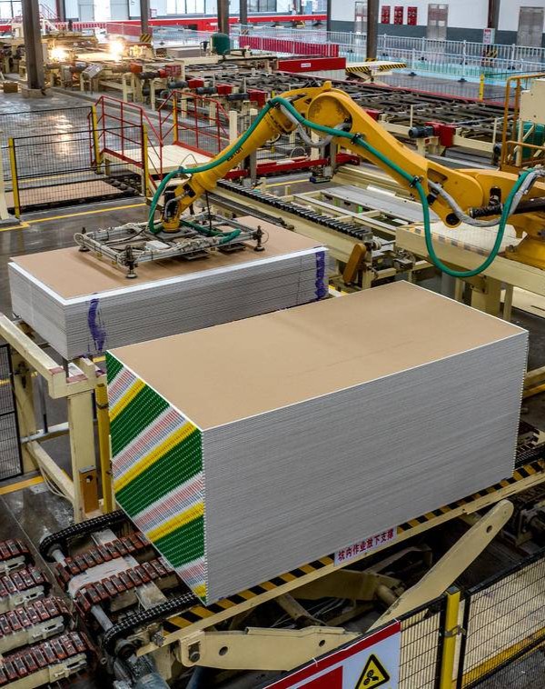 1月2日,位于宜都市化工园区的泰山石膏(宜昌)有限公司,一张张平整光洁、强度高的纸面石膏板正在传输带上快速移动。(湖北日报全媒记者 刘曙松 通讯员 朱灿义 黎文来 摄)