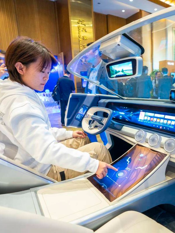 图为2023TCL华星全球显示生态大会现场,工作人员展示新能源汽车智能座舱。(湖北日报全媒记者 魏铼 摄)