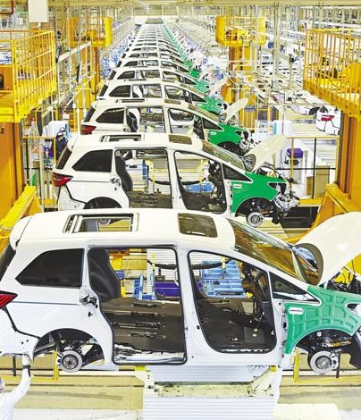易捷特新能源汽车有限公司总装车间里,生产线上一派繁忙,每两分钟就有一台新能源汽车下线。