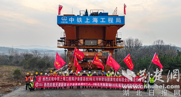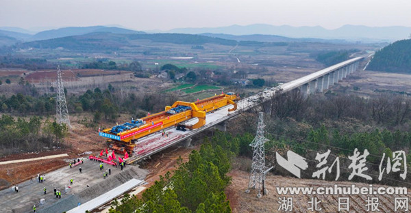 荆楚网(湖北日报网)讯(通讯员 刘波、余琴)1月22日上午7时58分,随着最后一榀重达900吨的箱梁平稳架设在沪渝蓉高铁京山市雁门口段青山坡水库特大桥桥墩上,标志着沪渝蓉高铁雁门口段箱梁架设施工全部完成,项目即将全面进入桥面施工阶段。
