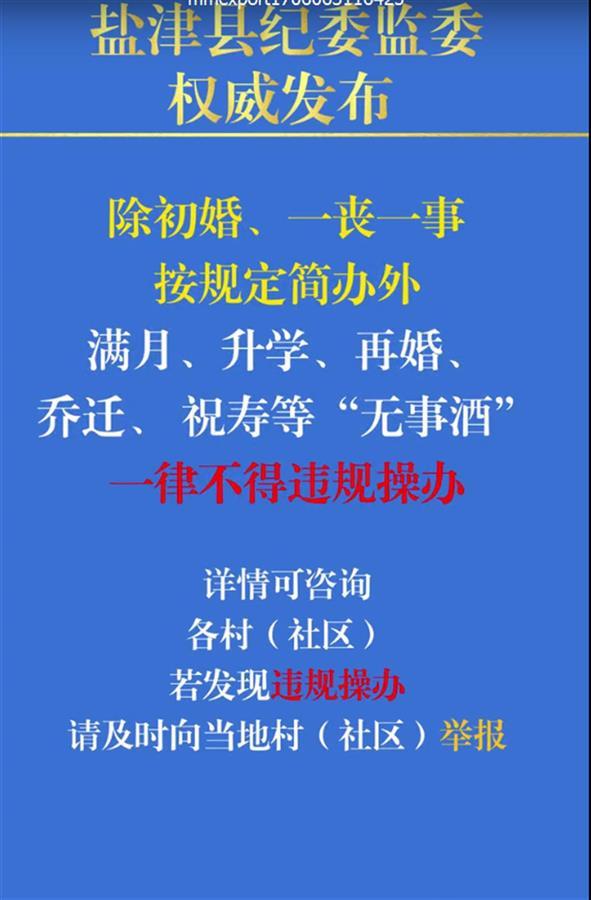 1月23日,云南昭通盐津县纪检监察宣传教育中心在某平台官方账号发布了一条通知,受到网友关注。通知要求,除初婚、一丧一事按规定简办外,满月、升学、再婚、乔迁、祝寿等“无事酒”一律不得违规操办。若发现违规操办,请及时向当地村(社区)举报;若发现党员、公职人员违规操办,请及时拨打12388举报。