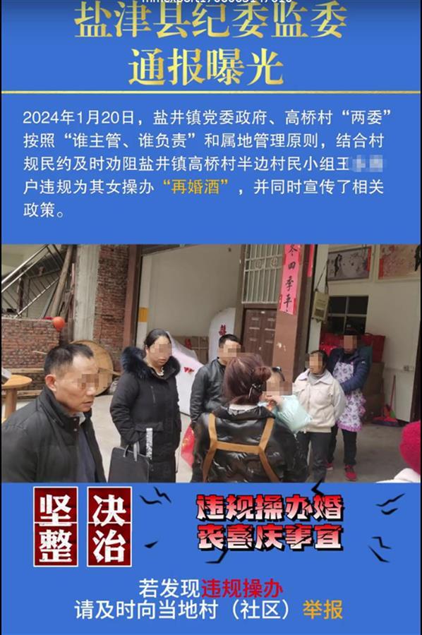 极目新闻记者注意到,该账号于1月22日发布的一条通报称,1月20日,盐井镇政府、高桥村“两委”结合村规民约,及时劝阻高桥村半边村民小组村民王某为其女操办“再婚酒”。