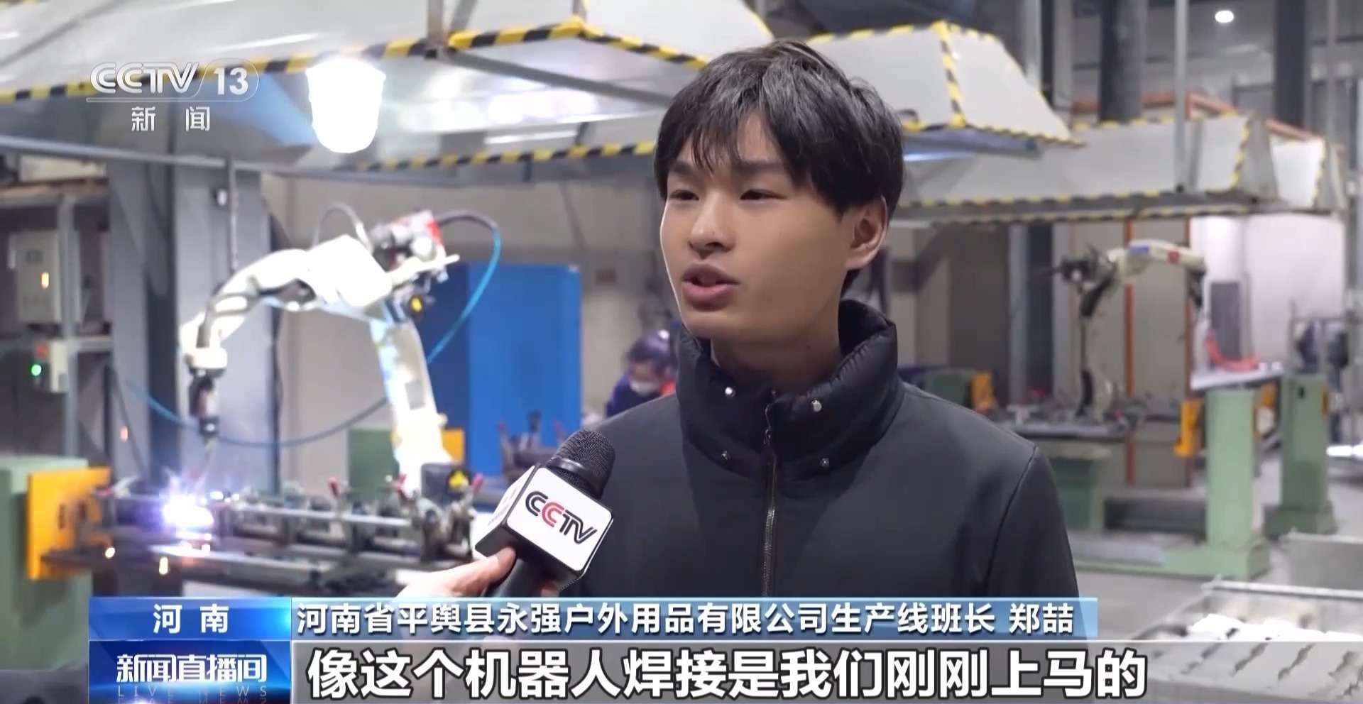 河南省平舆县永强户外用品有限公司生产线班长 郑喆:像这个机器人焊接是我们刚刚上马的,普通员工只需要放置材料就行,大大提高了我们的生产效率和品质。