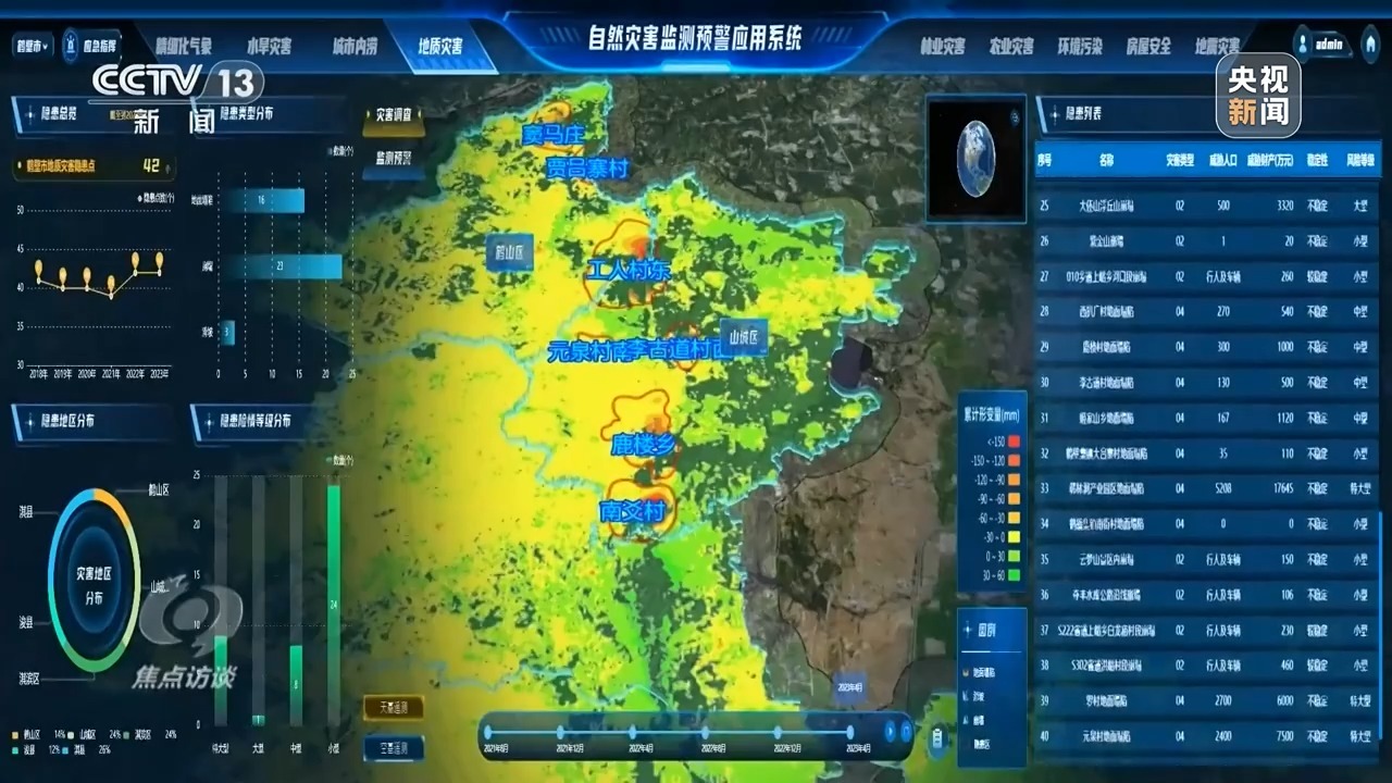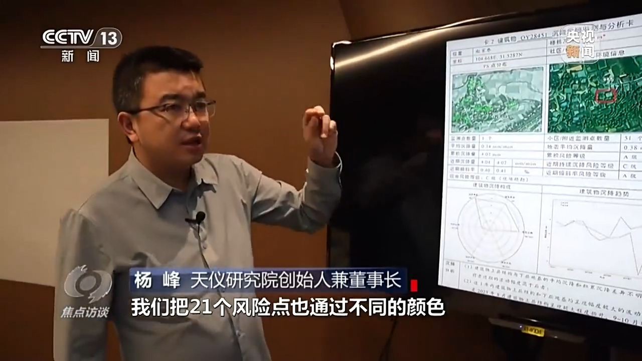 天仪研究院创始人兼董事长 杨峰:我们发现涪城区主城区的建筑和楼房的沉降有21个风险点,我们把21个风险点通过不同颜色区分出风险级别,然后把这些风险点汇报给了当地的住建部门。