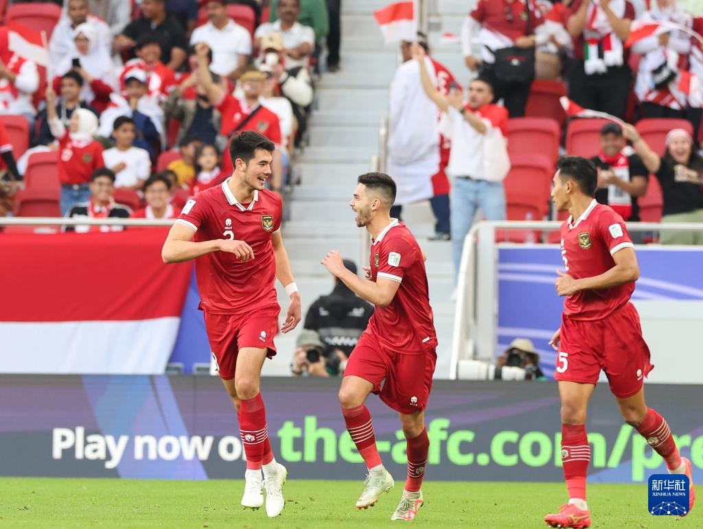 1月24日,印度尼西亚队球员在比赛中庆祝进球。新华社记者 丁汀 摄