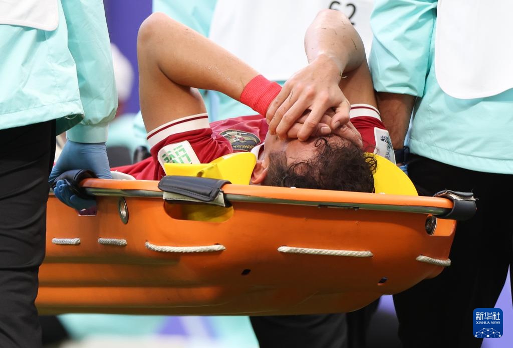 1月24日,印度尼西亚队球员维克里在比赛中受伤离场。新华社记者 丁汀 摄