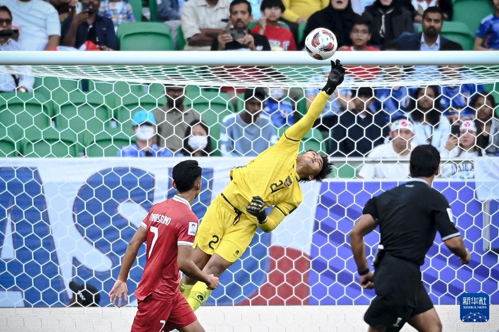 1月24日,印度尼西亚队守门员埃尔南多·阿里·苏塔尔亚迪(左二)在比赛中扑救。新华社记者 江汉 摄