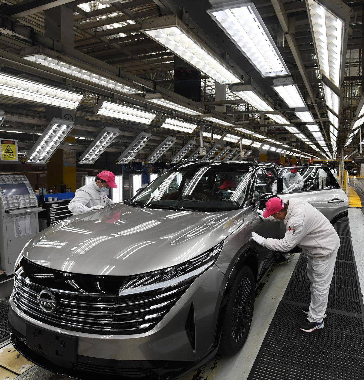 东风日产襄阳工厂检测线上,全新大家庭旗舰SUV“探陆”进行量产。(湖北日报全媒记者田悦 通讯员 赵静怡 摄)