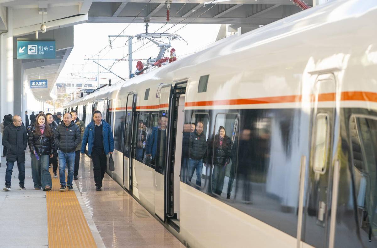 1月24日,武汉东站站台,一列崭新的“新城快线”列车即将驶出。 (湖北日报全媒记者 魏铼 通讯员 张璨龙 赵倩 摄)