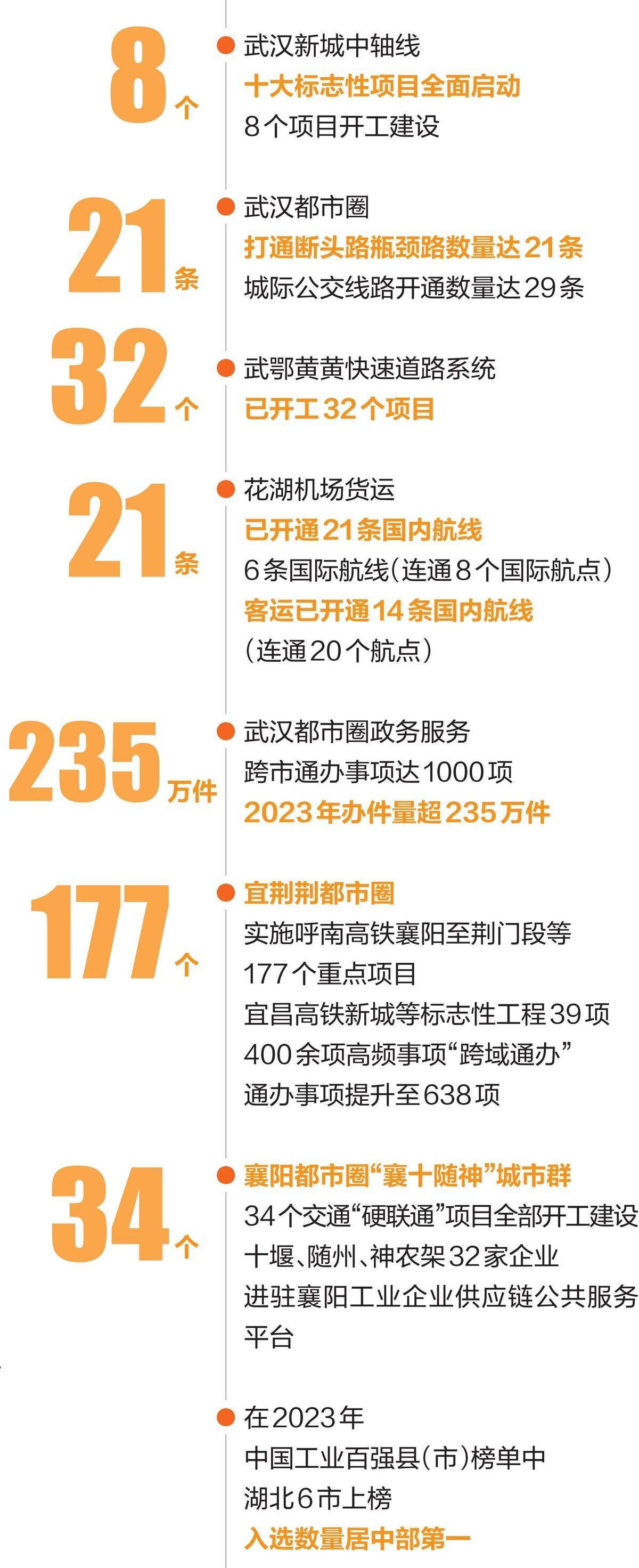 协同发展,产业为要。武汉都市圈聚焦光电子信息、高端装备、生命健康等优势产业,加快推动产业协同联动,葛店开发区与光谷共建光电子信息产业聚集区,黄石与武汉组建产业联盟,121家规上工业企业与武汉产业配套。宜荆荆都市圈组建以兴发集团为链主龙头企业的磷化工供应链平台。襄阳加快推进远景零碳产业园智能制造基地等一批重大产业引领工程项目。