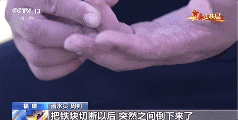 由于水下压力大,周钊的身上有被潜水衣勒出的道道血痕,手上也被割枪灼出了大大小小的伤痕,他的一根手指甚至在潜水作业中被压断了一截。