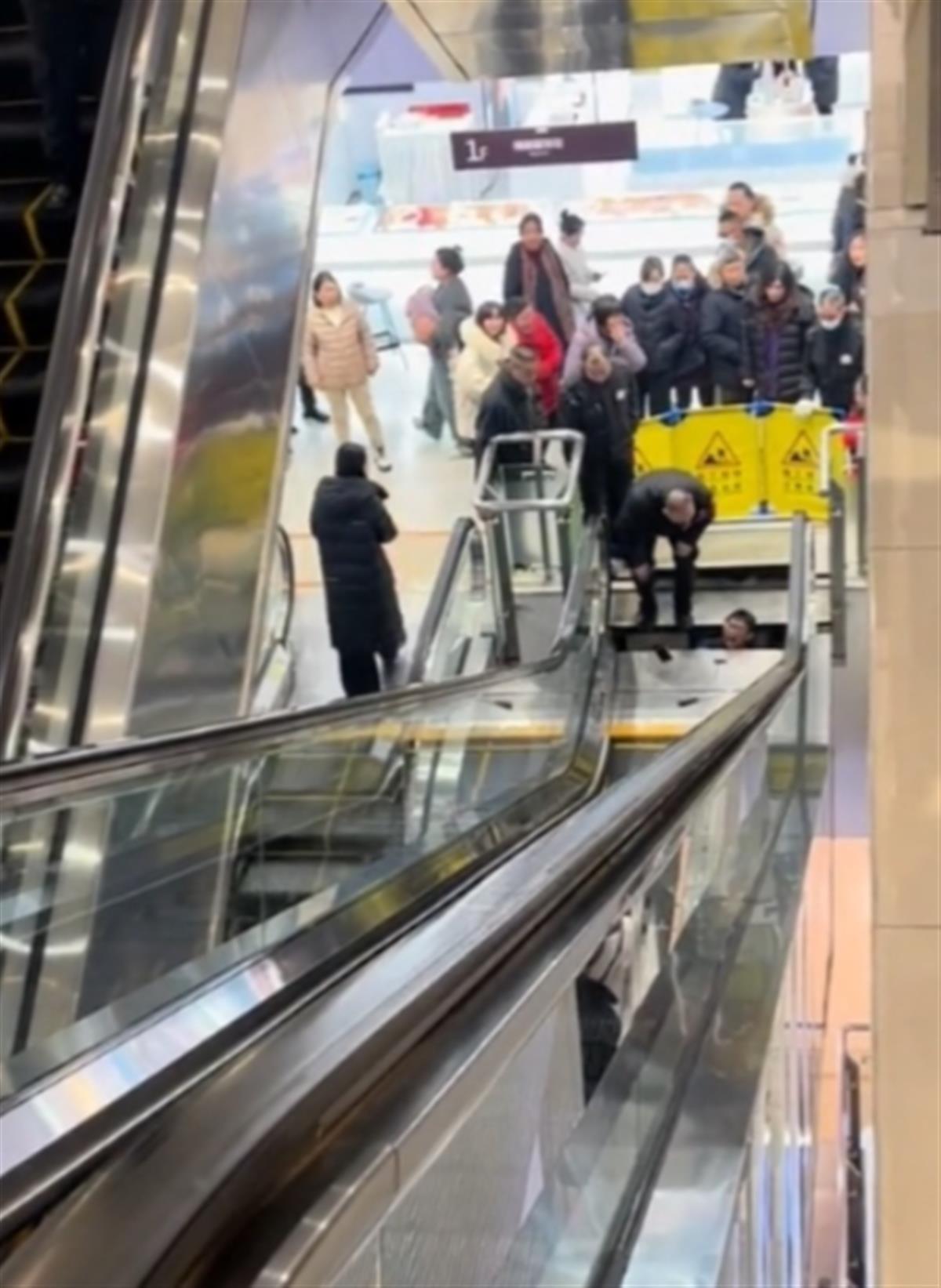 视频中,在一个商场手扶电梯下端,盖板下有人被困并发出惨叫声,事发周围设了警示围挡,几名男子合力尝试解救被困人员。