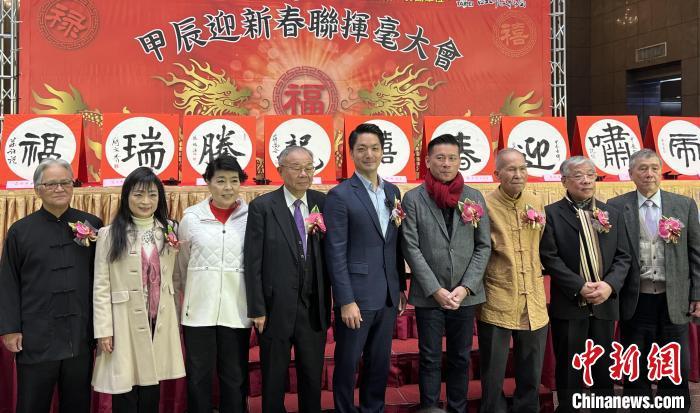 1月26日,“龙腾瑞台北·虎啸迎春禧”甲辰迎新春联挥毫大会在台北举办。图为台北市市长蒋万安(左5)、台湾知名书法家张炳煌(左4)等人士在现场合影。中新社记者 路梅 摄
