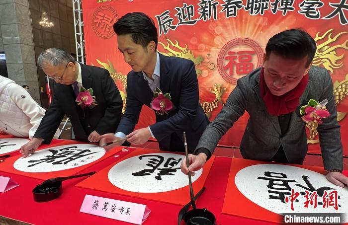 1月26日,“龙腾瑞台北·虎啸迎春禧”甲辰迎新春联挥毫大会在台北举办。图为台湾知名书法家张炳煌(左)、台北市市长蒋万安(中)等人士现场挥毫。 中新社记者 路梅 摄