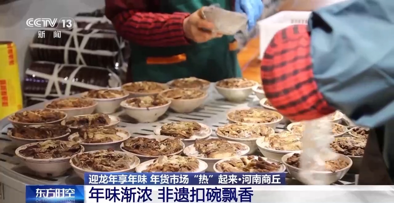 扣碗,也叫蒸碗,寓意着“蒸蒸日上”,是豫东美食,也是当地家家户户春节餐桌上必备的年味。随着农历新年的临近,河南商丘多家老字号扣碗的定制、销售进入高峰期,蒸笼里香飘四溢,年味渐浓,前来购买的市民络绎不绝,店内的厨师们忙碌不停。