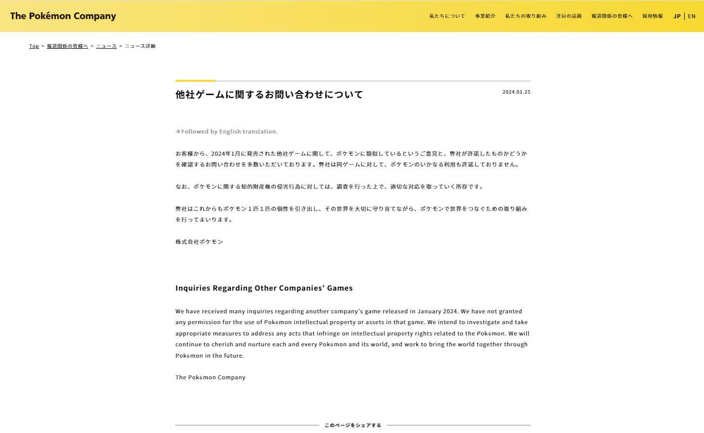 1月25日,宝可梦公司发布公告称,已经收到了许多关于另一家公司在2024年1月发布的游戏的询问。公司尚未授予在该游戏中使用宝可梦知识产权或资产的任何许可。