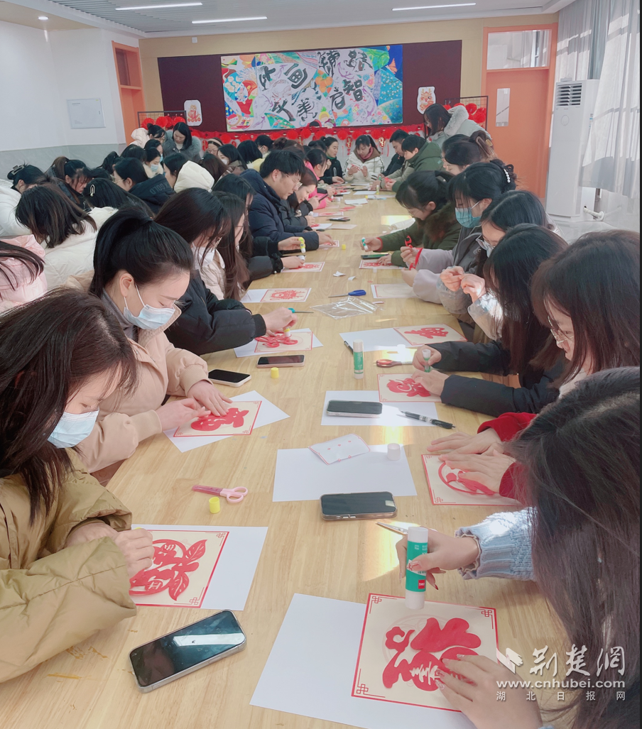 一把剪刀、一张彩纸、一双巧手,不一会儿,龙凤呈祥、十二生肖等一幅幅充满年味的作品“跃然纸上”。在剪纸艺术体验中,每位教师创作出剪纸作品。活动现场充满了欢乐祥和的新年气息。