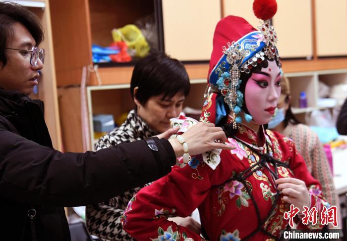 演出开始前,该剧主演刘泳渤在工作人员的协助下调整戏装。 中新网记者刘可耕摄