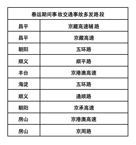 近日,北京交管部门公布2024年春运期间交通流预判和易拥堵路段,交通事故多发路段。