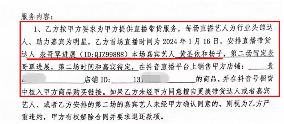 极目新闻记者获取的2份直播带货协议显示,协议中均明确约定了杨子、黄圣依将助力带货,但其中一名商家称她的货物售卖时直播间里只有覃进展,而另一名商家则表示,她的货物根本就没有在直播间出现,他们现在的诉求就是该公司退款。