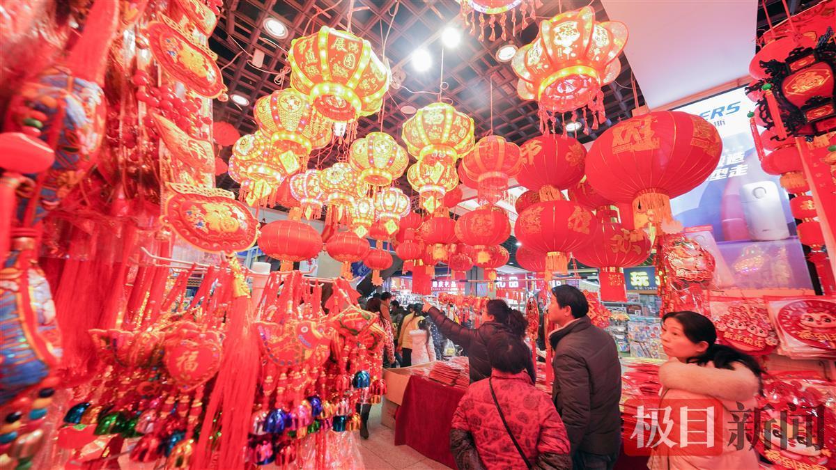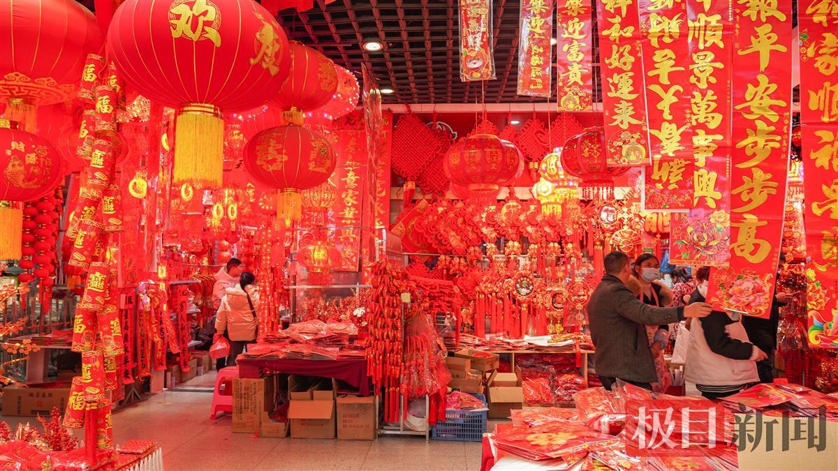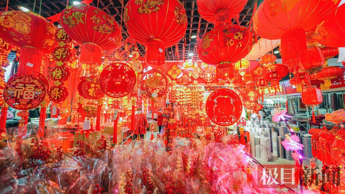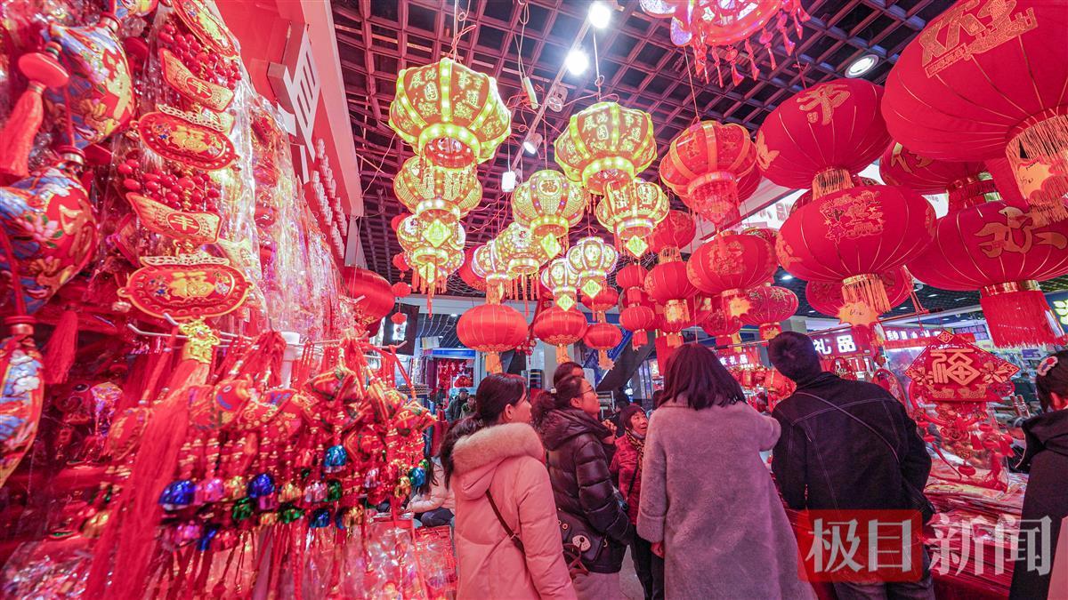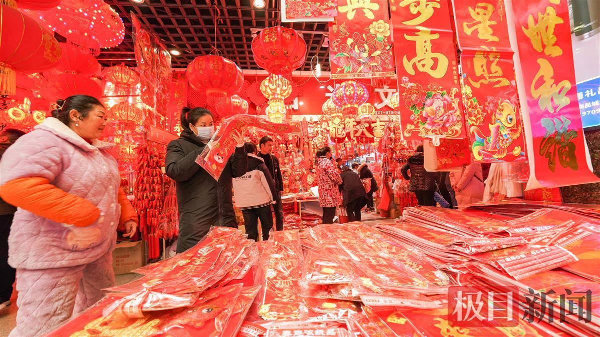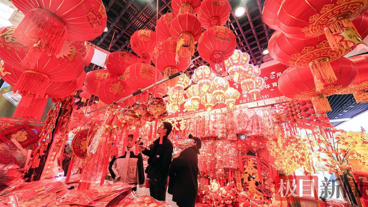 春节临近,江城到处都弥漫着浓浓的喜庆氛围。1月28日,众多市民在湖北省武汉市汉口北国际贸易城挑选春节饰品,红红火火迎新春。灯笼、对联、窗花、年画、龙年玩偶、挂饰等新春饰品,透着浓浓的年味。