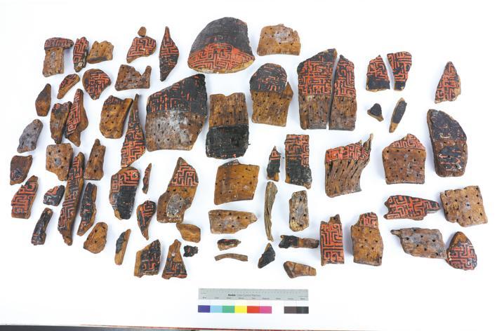 2018年,杜道子为这面建鼓脱水,此时,它已出土整整30年。“脱水后,这面建鼓就是七八十片碎片。这些碎片在诉说,它在春秋时期已经被使用者修过,后来又被盗墓贼弄散架了。”在杜道子看来,每一件文物都在用身体默默讲述它们的故事。“整理纹饰、形状,拼对就花了2年时间……没有先例可以进行参考,所以修复的时候非常谨慎。”杜道子说,出土的漆器大多存在饱水、糟朽、断裂、变形等病害,漆物上的花纹自然也缺失了,过去的花纹多为龙纹、凤纹,在细节上会非常复杂,具有连续性,也就是俗话说的对称图形,修复过程中,就会按照现有的依据,对照完成另一边所缺失的图案。