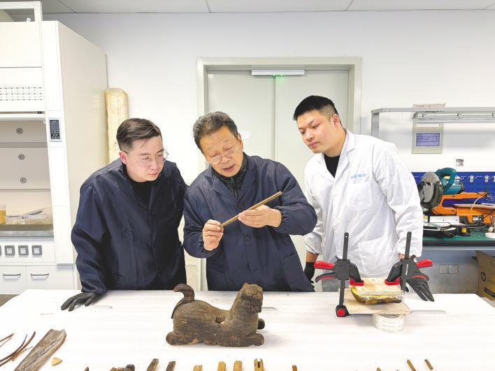 “师傅传授的不仅是技艺,更是工匠精神。”32岁的修复师陈亦奇说,2018年,他从中国科学技术大学毕业后,成为杜道子的弟子,除了学习传统技艺,还学习红外光谱分析和X射线衍射分析等多种科技手段,并应用到文物保护和修复中。他的身边,同样32岁的修复师龚祥炜已屏气“盯着”一根破破烂烂的“小木棍”多时。面对记者询问,他指着这根2000多年前的“小木棍”介绍:“你看,这件文物修复过,但线条颜色不一致,脱水痕迹还要进一步处理。”