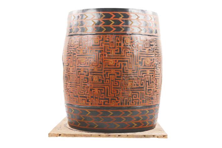 修复后的建鼓,鼓身髹黑色底漆,通体施红色变形窃曲纹,面覆牛皮,完整精致。
