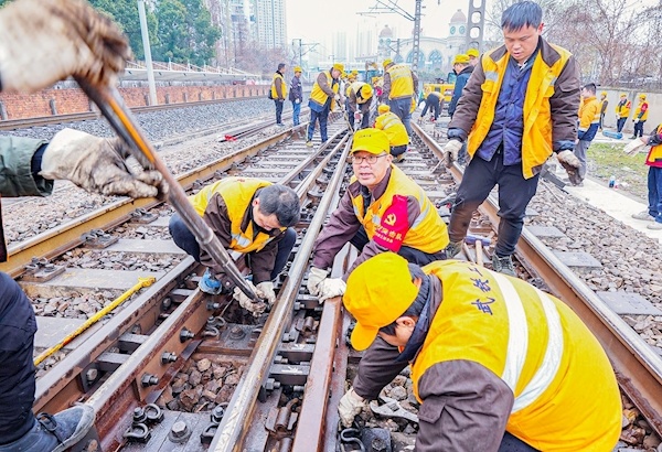 1月18日中午,北风夹杂着小雨扑面而来,室外气温只有不到5℃。在汉口火车站附近一段铁路线上,武铁武汉桥工段汉口线路车间40余名“小黄人”正在集结,一场换轨攻坚战即将打响。