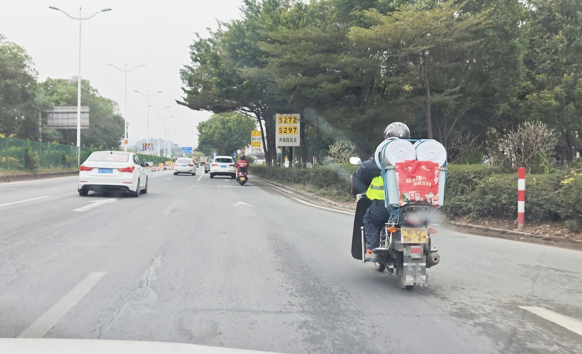 近300公里的路上,偶尔能看到几名骑摩托返乡的务工者,他们的车牌号大都是与广东相邻的广西梧州、贵港等地。有的是单人单骑,有的是夫妻同行,但摩托车尾都会结结实实绑上多件行李。骑行者们也是全副武装,除了穿着厚厚的棉衣,外面还套上一层雨衣,坐在后座的人还给双脚套上红色塑料袋。