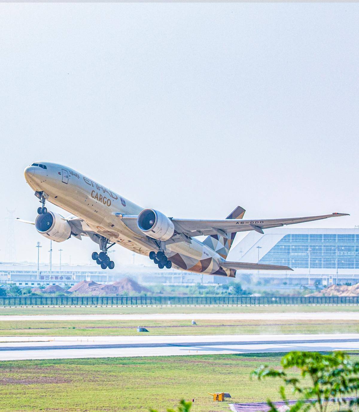2023年8月18日,一架阿提哈德航空的波音777-200全货机在鄂州花湖机场起飞。(湖北日报全媒记者 薛婷 摄)
