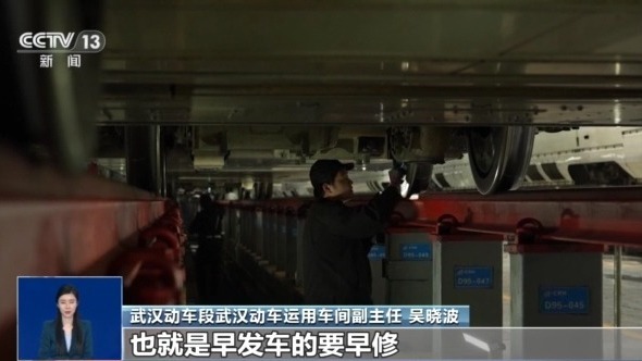 武汉动车段武汉动车运用车间副主任 吴晓波:目前计划的2月2日开始到2月8日,这6天我们没有任何检备车,就相当于所有的车全部在上线运营,检修要求和标准也就相对应会增加。在零检备的状况下,可能只有两个半小时就要把它检修出来,对调车和生产组织这块压力就增加了。我们的目标就是在零检备的情况下,确保安安全全把旅客送到家。