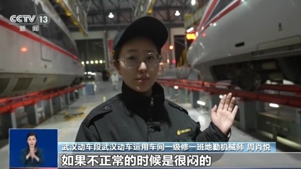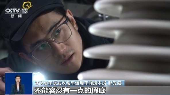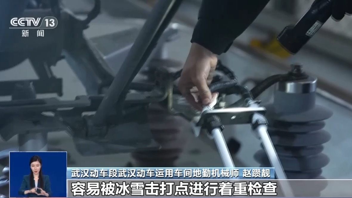 武汉动车段武汉动车运用车间地勤机械师 赵躜靓:为了应对冬季运行安全问题,我们会对车顶的高压设备,车内的电茶炉、坐便器、座椅,车下的轮对、走行部,容易被冰雪击打点进行着重检查,保证我们的列车运行更加平稳,旅客乘坐舒适性会更高。