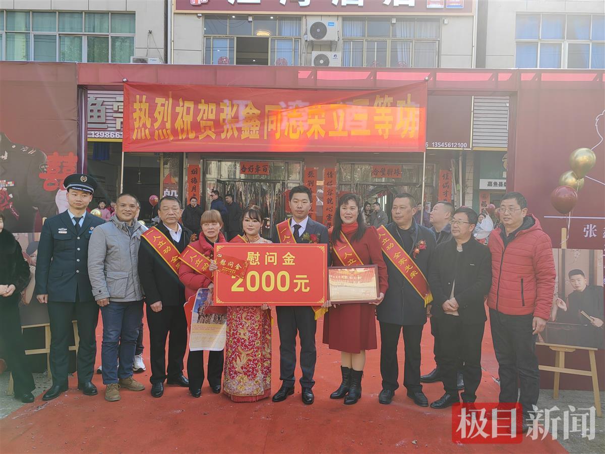 在阵阵锣鼓声中,在父老乡亲的见证下,湖北咸宁嘉鱼县退役军人事务局为张鑫及其家属佩戴“一人立功、全家光荣”的大红绶带,并送上立功的喜报和奖励金,以这种特殊的方式,向两位新人送上真挚的新婚祝福。