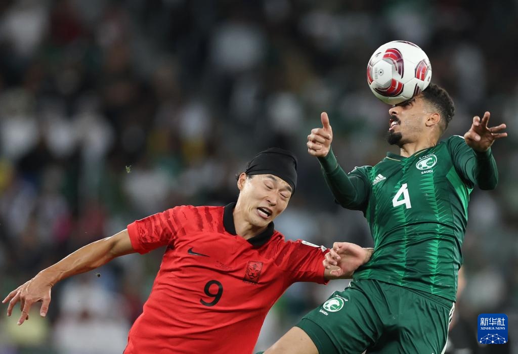 1月30日,韩国队球员金玟哉(左)与沙特阿拉伯队球员萨利赫·谢赫里在比赛中拼抢。新华社记者 贾浩成 摄