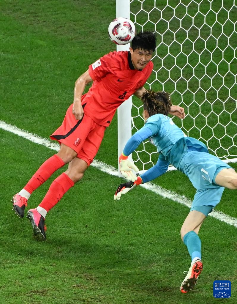 1月30日,韩国队球员曹圭成(左)在下半场比赛中头球击中横梁。新华社记者 孙凡越 摄
