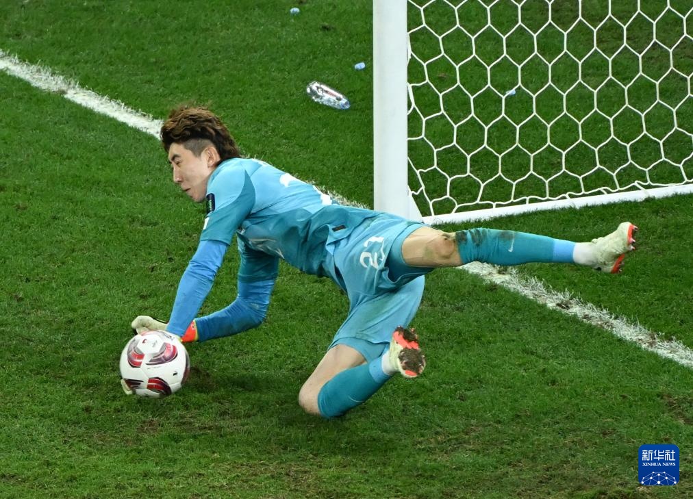 1月30日,韩国队守门员赵贤祐在点球大战中扑出沙特阿拉伯队球员萨米·纳吉的点球。新华社记者 孙凡越 摄