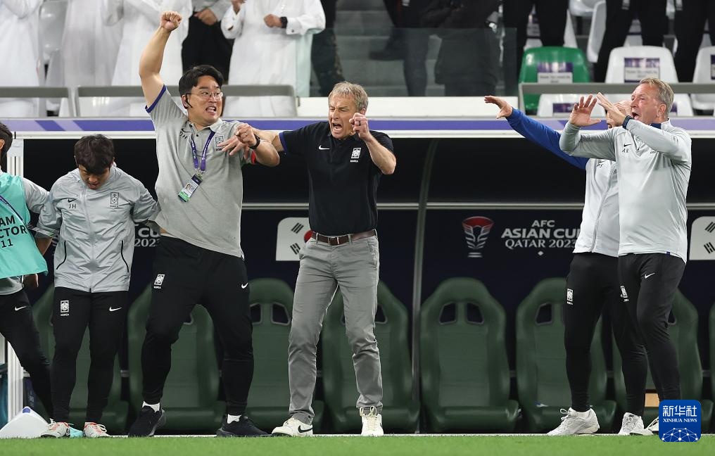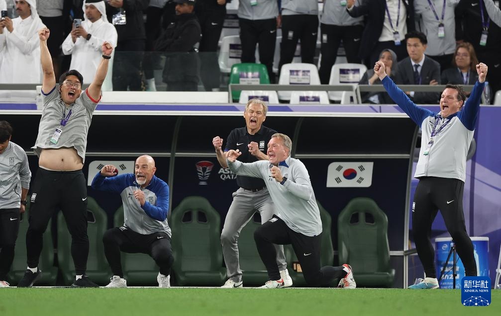 1月30日,韩国队主教练尤尔根·克林斯曼(右三)在点球大战中庆祝。新华社记者 曹灿 摄