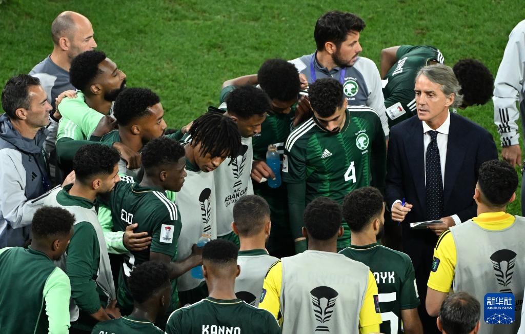 1月30日,沙特阿拉伯队主教练罗伯托·曼奇尼(上右)在点球大战前布置战术。新华社记者 孙凡越 摄