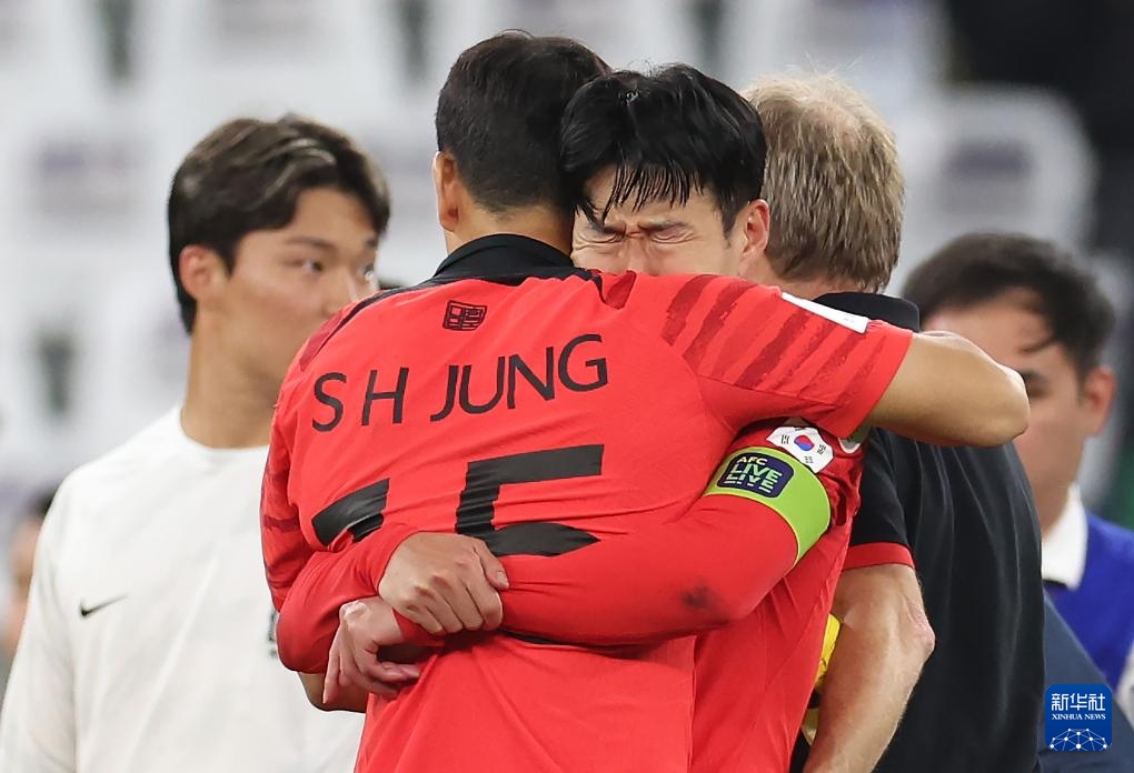 1月30日,韩国队球员孙兴慜(前右)在比赛后落泪。新华社记者 曹灿 摄