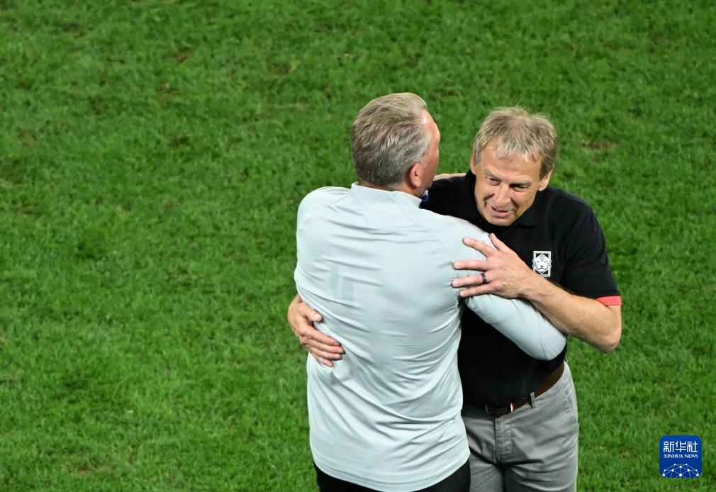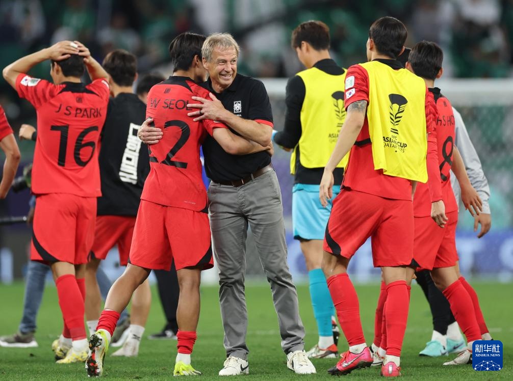 1月30日,韩国队主教练尤尔根·克林斯曼(右)在比赛后庆祝。新华社记者 孙凡越 摄