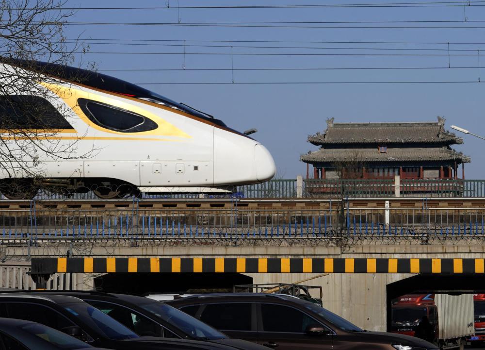 ↑一列复兴号动车组列车在北京永定门城楼附近的京津城际铁路上行驶。