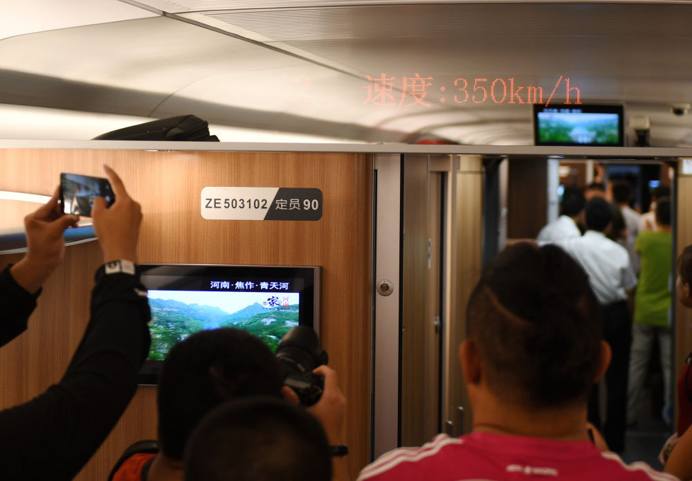 ↑2018年8月8日,在C2581次列车上,乘客用手机、相机记录下列车时速。