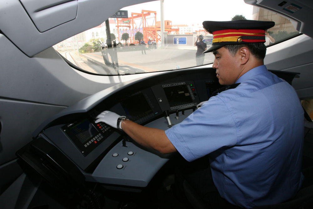 ↑2008年8月1日,动车组列车驾驶员在驾驶室操作机车。